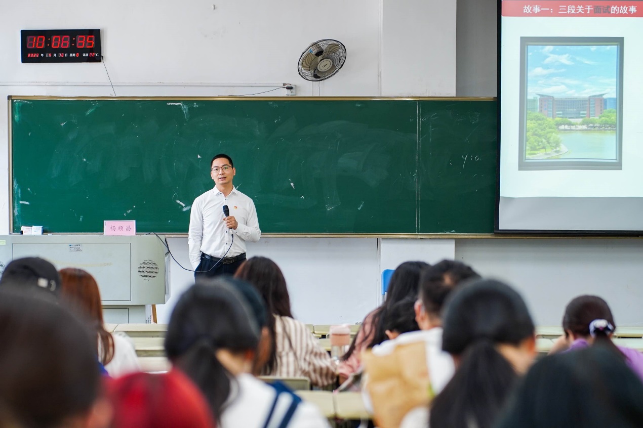 杨顺昌老师以“一位‘老学长’的学生工作故事”为题,从自身竞选学生干部面试、研究生支教团面试和辅导员面试的经历出发,用四个故事回答了“我们为什么要当学生干部”“学习与学生工作”“学生干部需要具备的核心能力”“决定人际关系的因素”等问题,鼓励全体学员培养正确的心态,在热爱与责任的道路上越走越广。