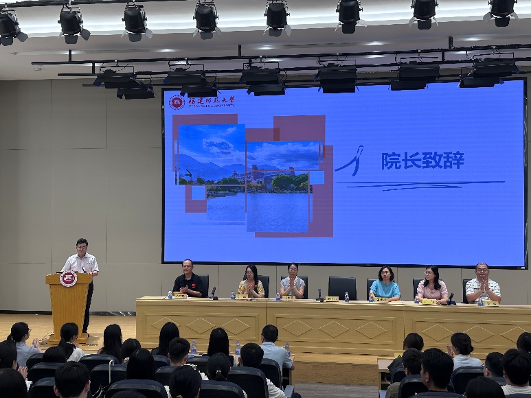 在致辞环节,学院院长、MPA中心主任谢宏忠教授以“溪源方破晓,长安又绿裳”的诗意语言,欢迎新生加入福师大MPA大家庭。他回顾了福建师范大学MPA教育20年的发展历程,并鼓励同学们注重理论与实践的融合,培养公共精神,在多学科交融中做到知行合一,在当代中国治理实践中做到既仰望星空又脚踏实地。