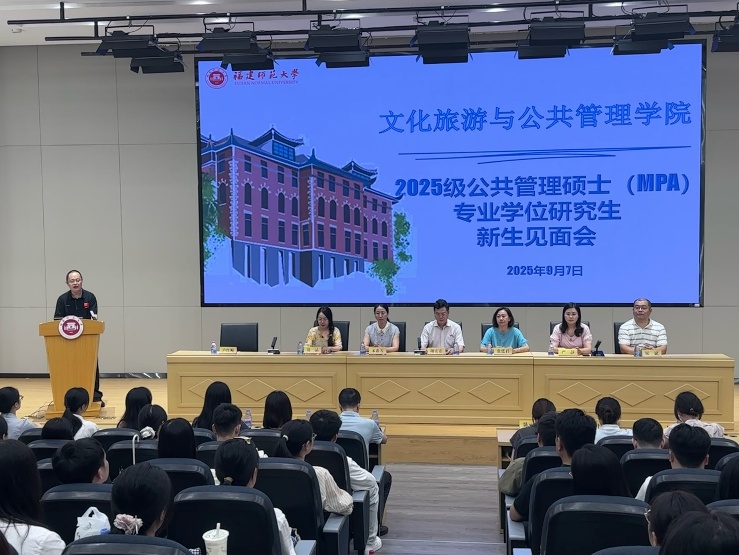 2025年9月7日下午,福建师范大学文化旅游与公共管理学院2025级公共管理硕士(MPA)专业学位研究生新生见面会在仓山校区田家炳楼一楼演播厅隆重举行。学院院长、MPA中心主任谢宏忠教授、副院长张廷君教授、MPA中心常务副主任卢红飚副教授、院务委员宋惠芳教授、MPA中心办公室相关负责人、MPA导师代表及2025级MPA全体新生参加了专业见面会,见面会由卢红飚副教授主持。