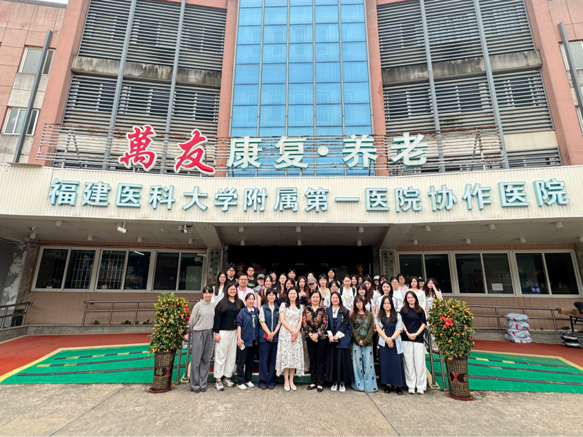 师生首站抵达马尾万友颐养院,在机构工作人员的引导下,同学们实地考察了颐养院居住环境、护理区域、活动空间及服务公示栏,详细了解养老院运营管理、服务内容、收费标准以及长期护理保险政策落地情况,直观感受医养结合机构在老年人生活照料、健康管理、康复护理、精神慰藉等方面的具体实践。万友颐养院工作人员讲解老年社会工作在机构养老中的角色定位与服务技巧,让同学们对养老服务一线场景与专业社工介入路径有了更加清晰、深刻的认识。