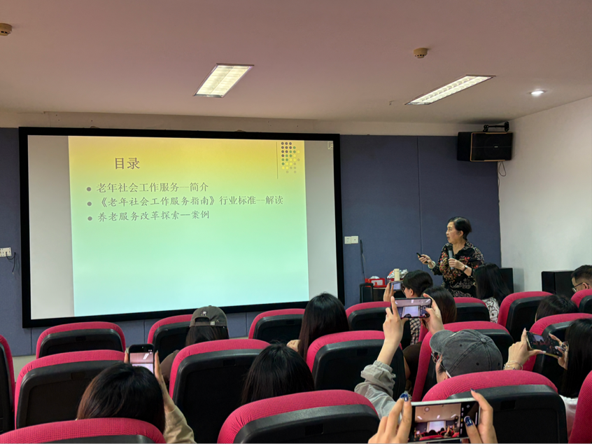 参访结束后,徐若兰副会长为师生带来老年社会工作专题讲座。讲座围绕老年人生理心理特征、老年社工服务指南、机构养老服务规范、相关政策解读与实务技巧展开,系统梳理老年社会工作理论框架、服务流程与核心方法,并结合一线案例分享实践经验,为同学们搭建起理论与实务衔接的学习桥梁。她强调:“作为社会工作专业,在参与养老院工作中,不能仅限于组织活动,更要依据相关政策为养老院的服务质量提升提供可行性建议。”